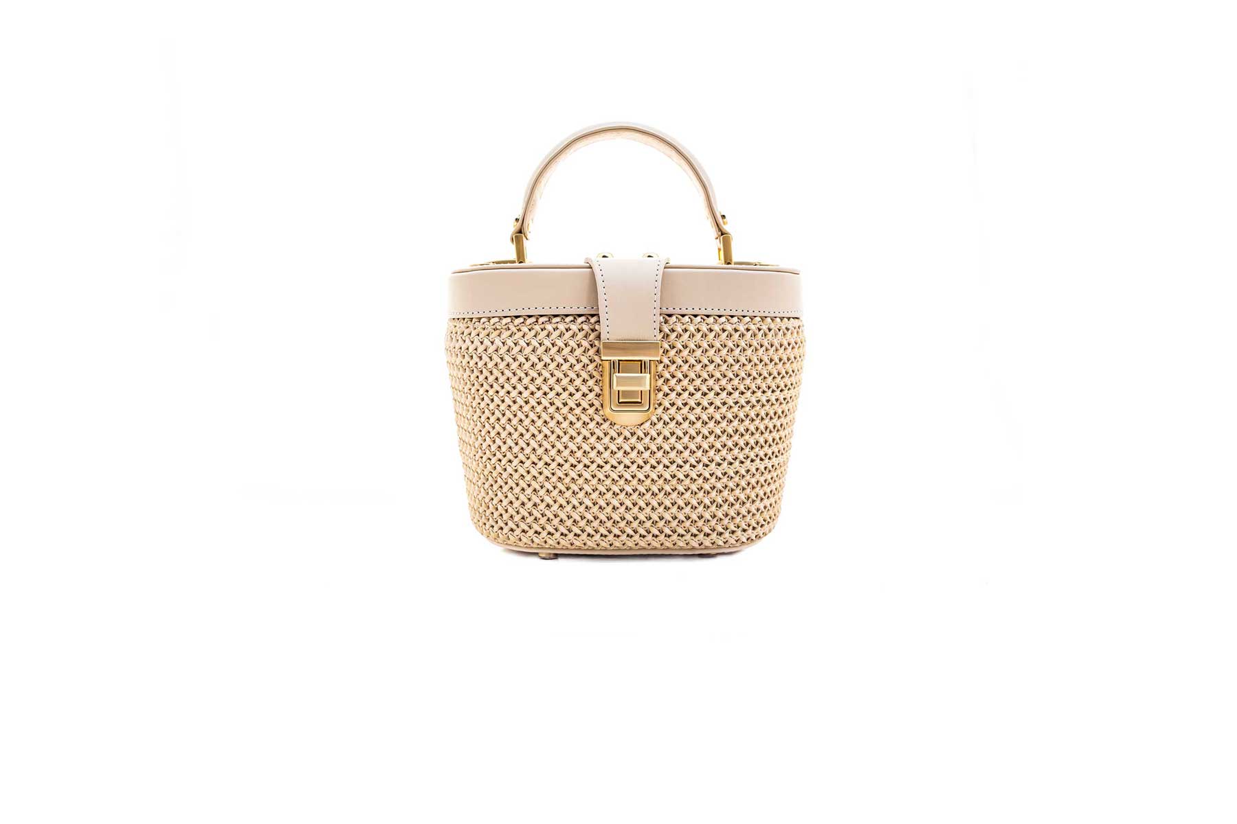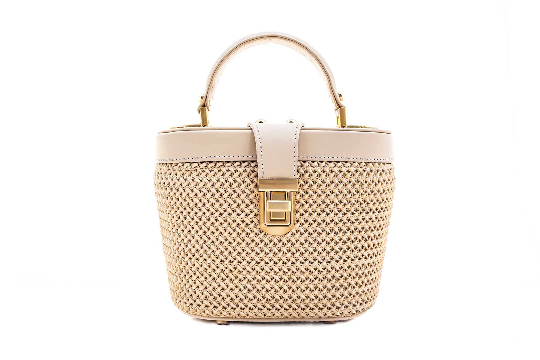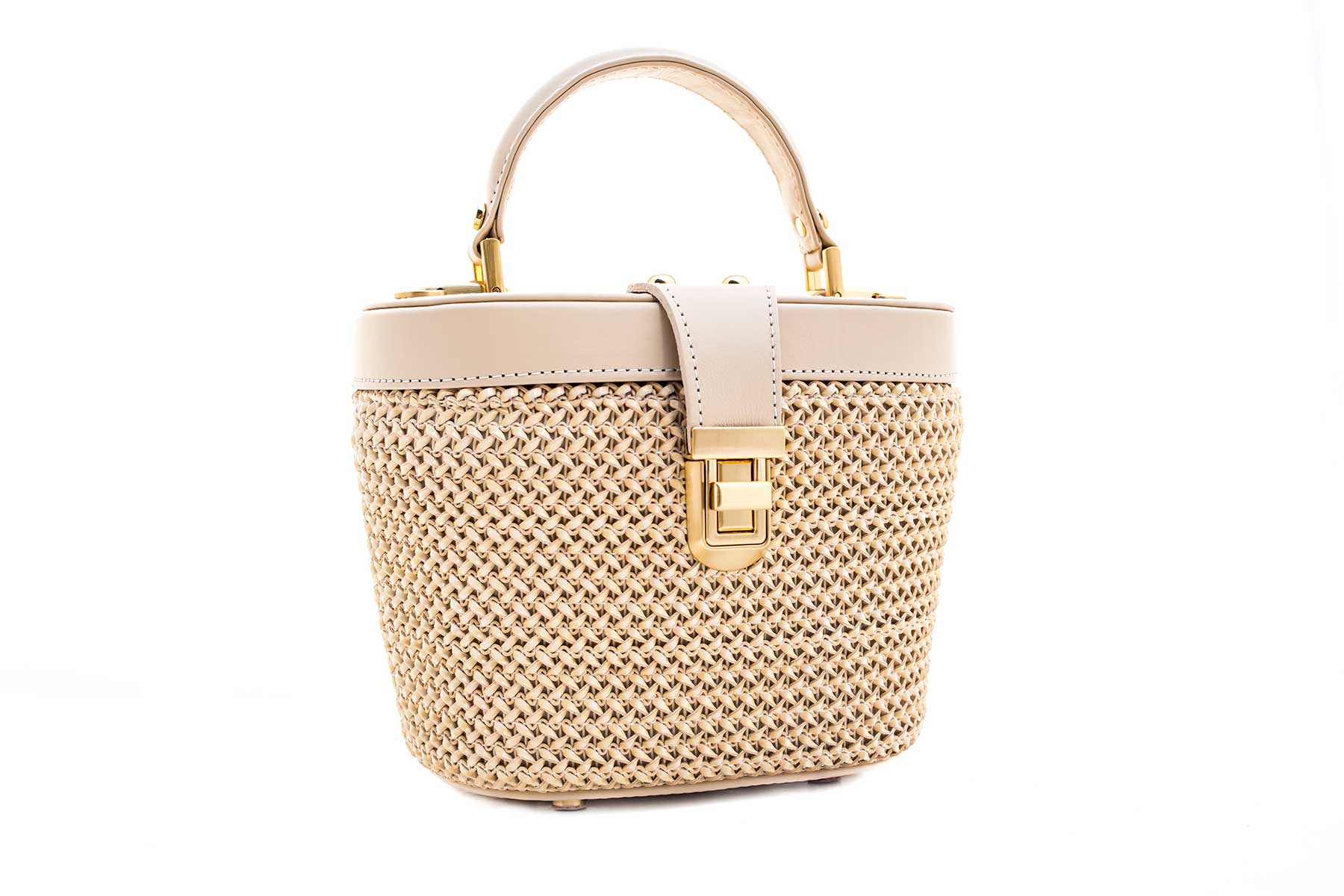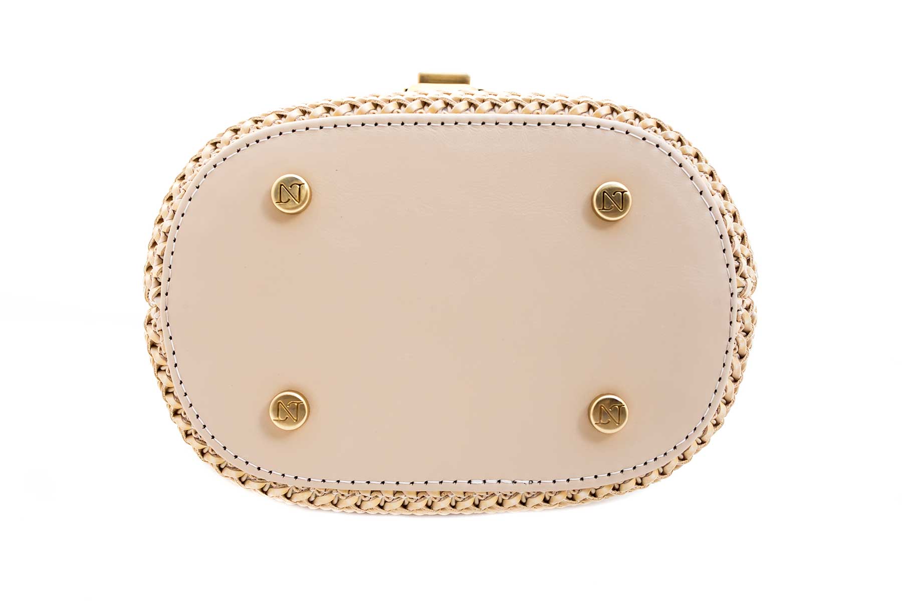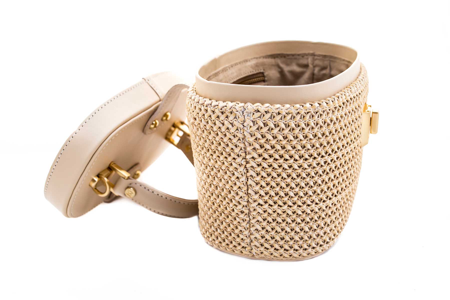 Matéria-prima:Tramado de fibra têxtil de ráfia combinada com polímeros, e couro legítimo.