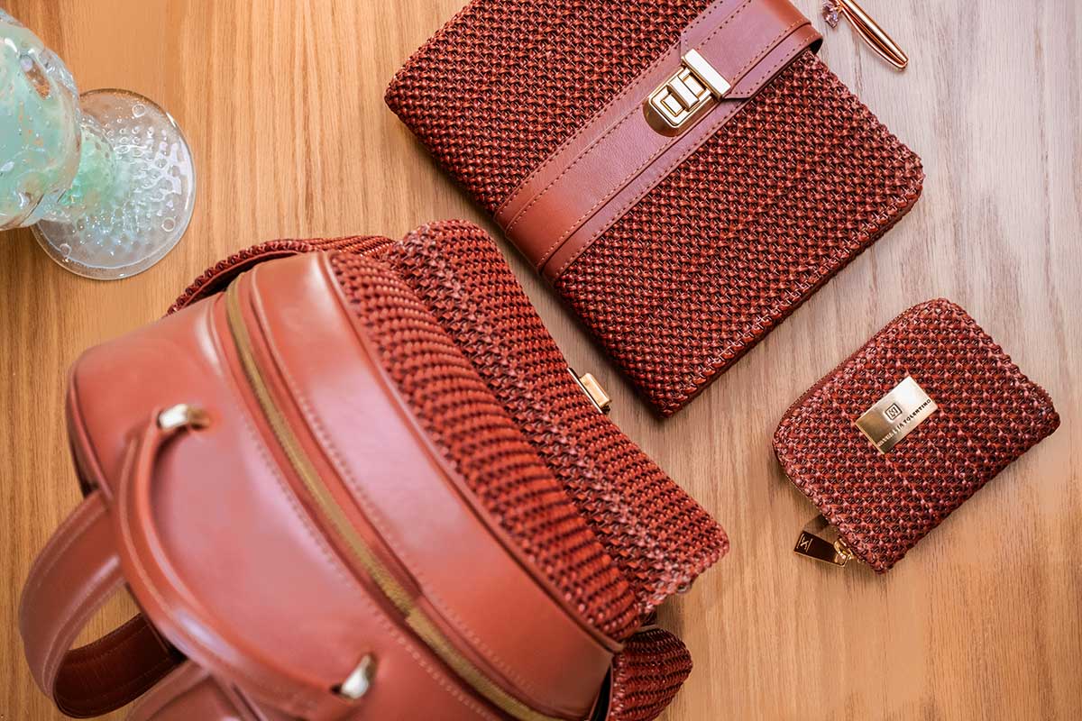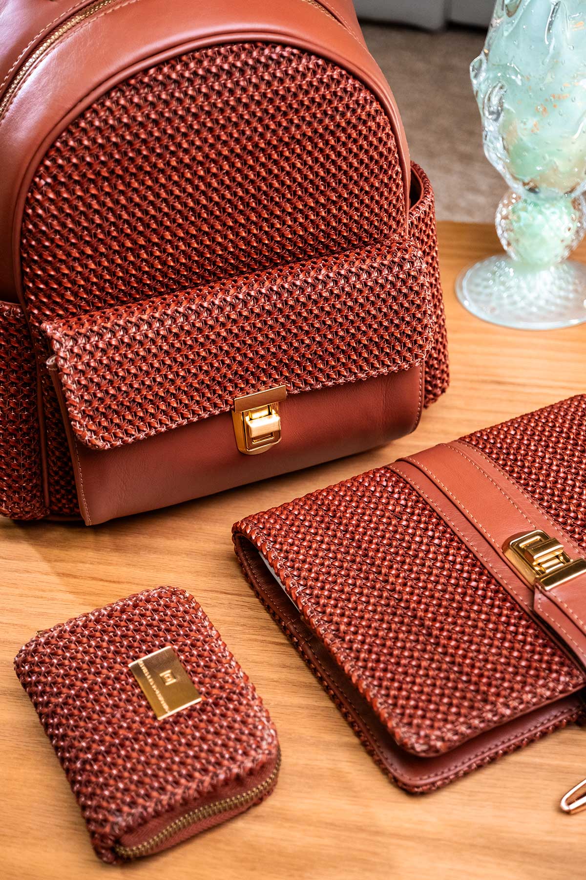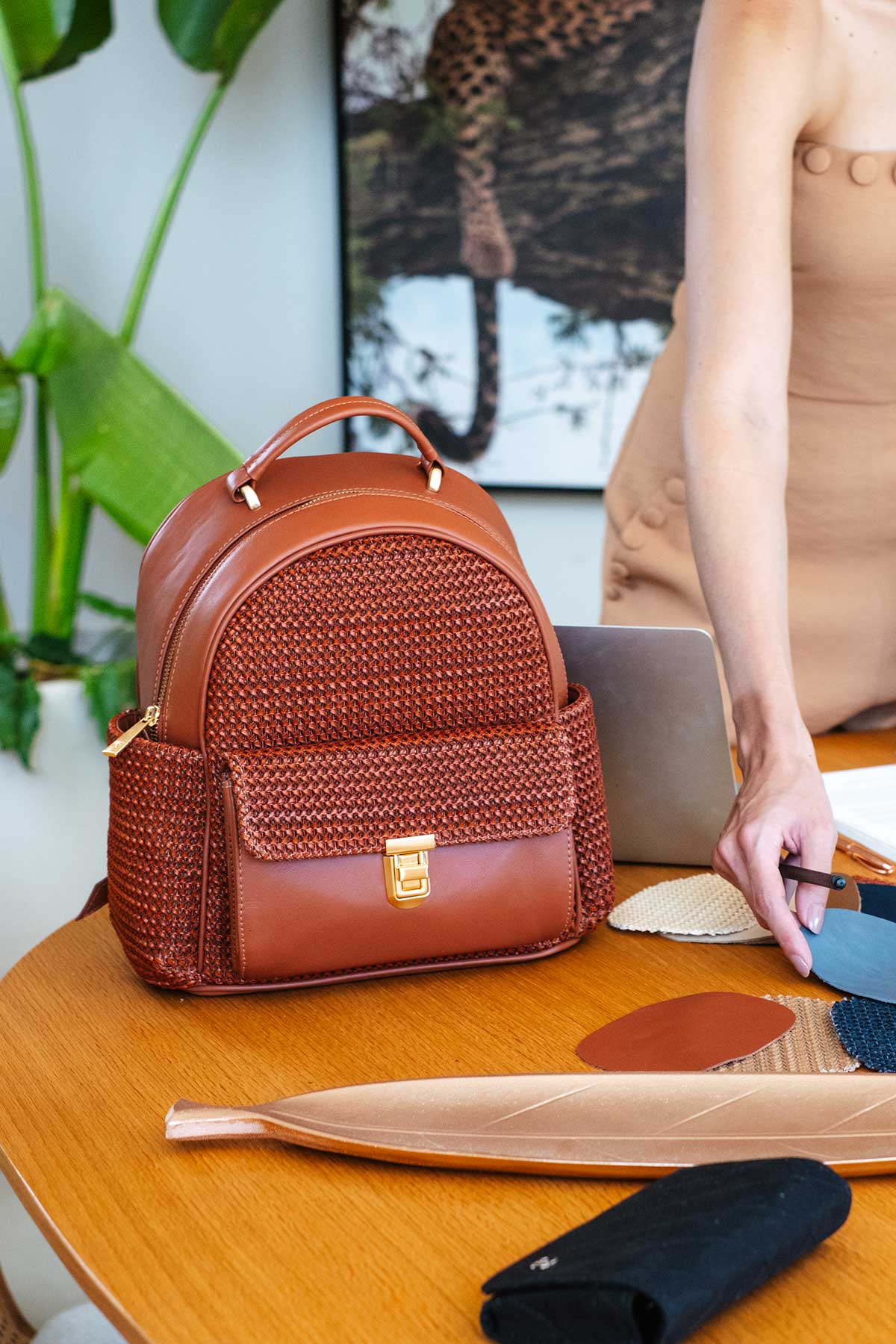 Material da bolsa: Mochila estruturada em couro e tramado de fibra têxtil de ráfia.