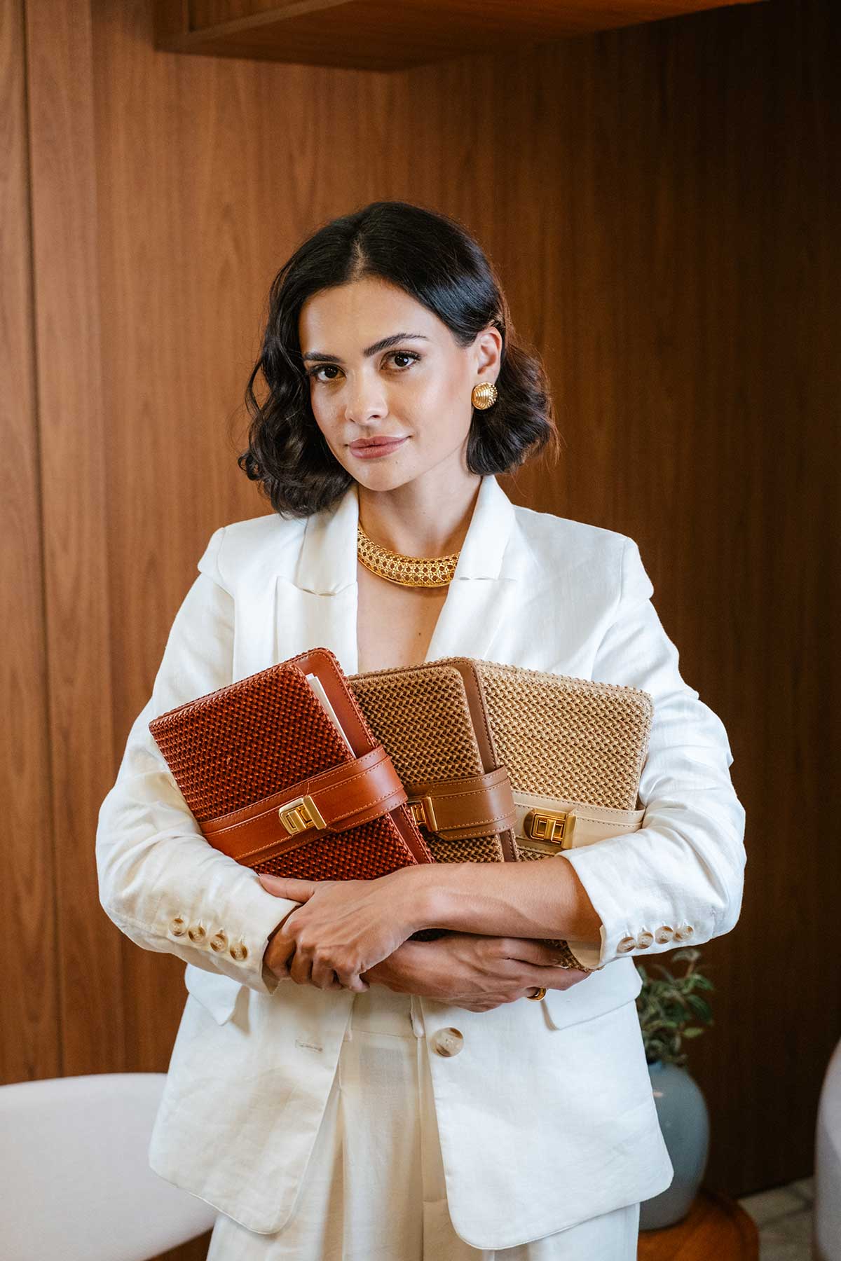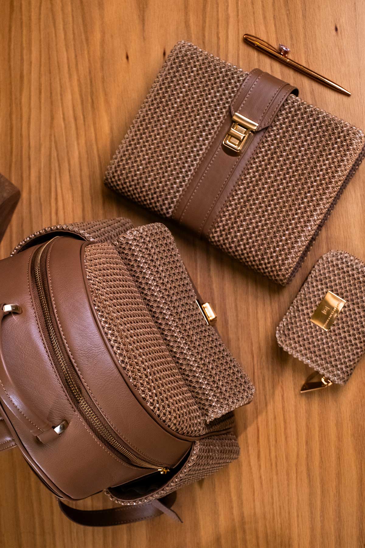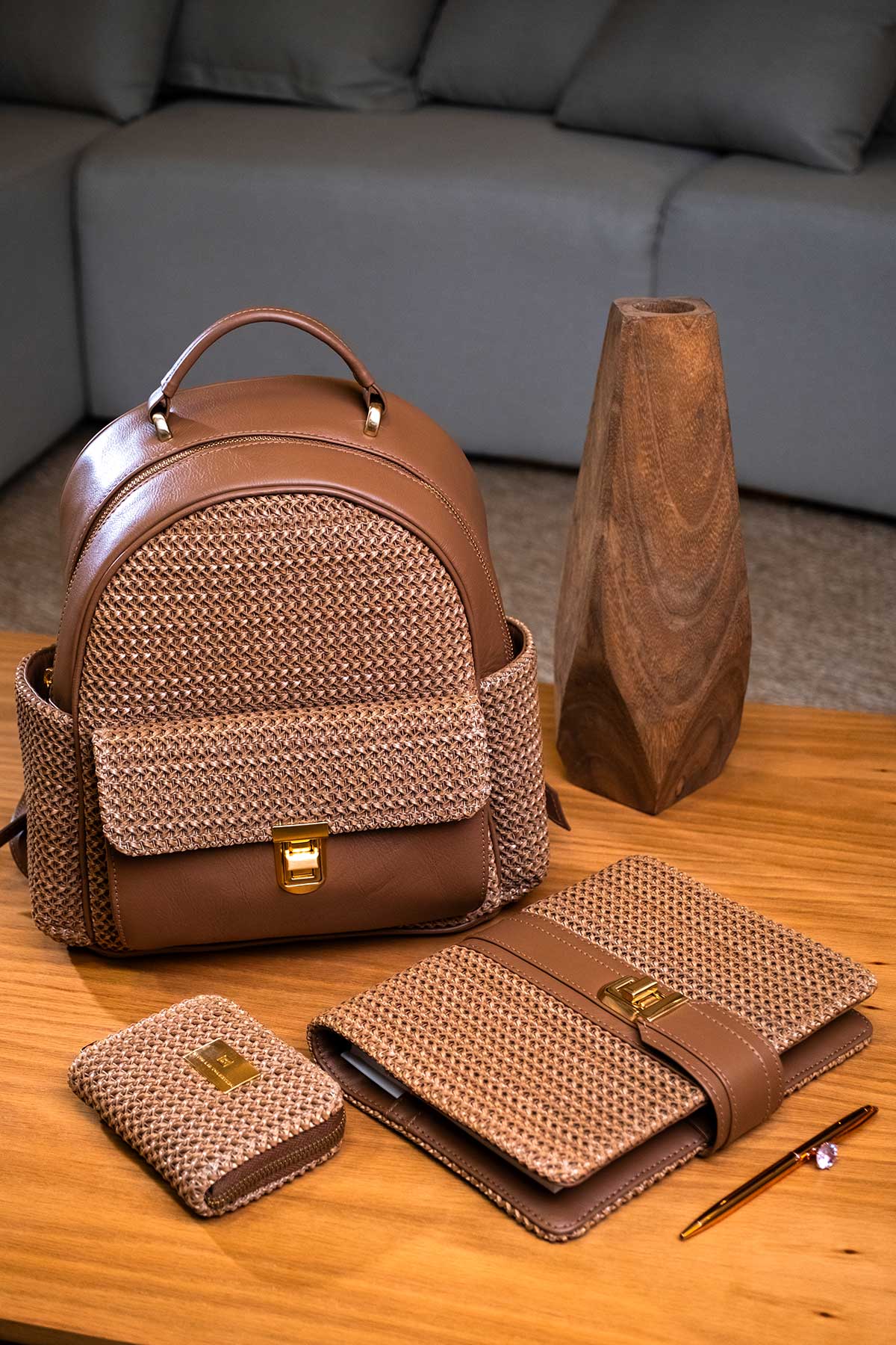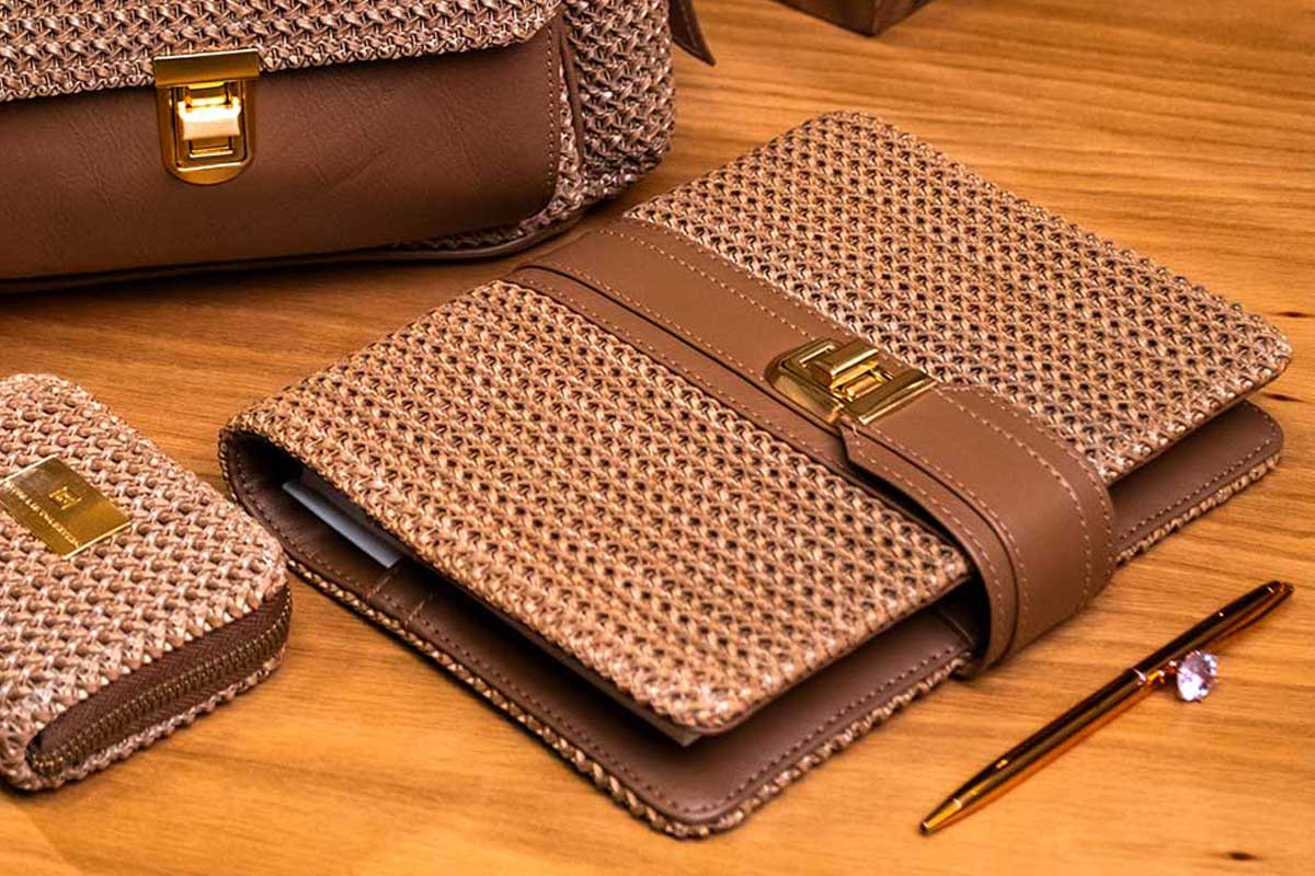 Tramado de fibra têxtil de ráfia e couro legítimo
