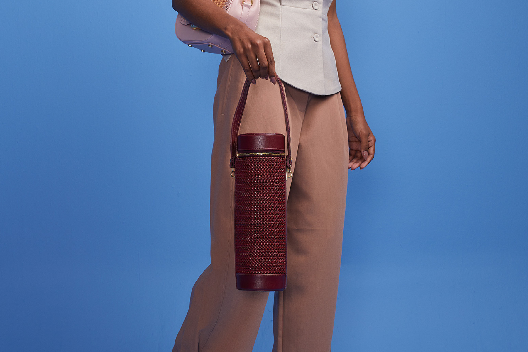 Porta vinho produzido em tramado de fibra têxtil de ráfia e couro legítimo, forrado em camurça.