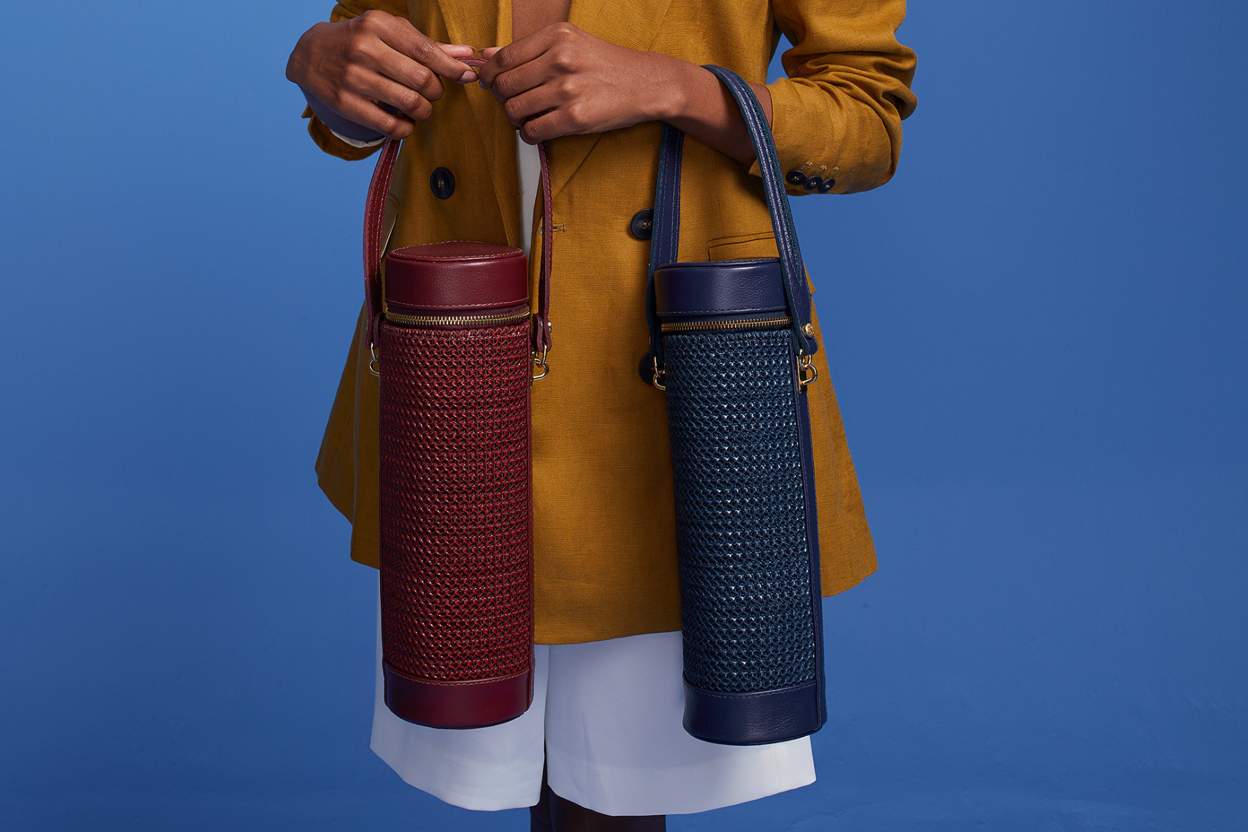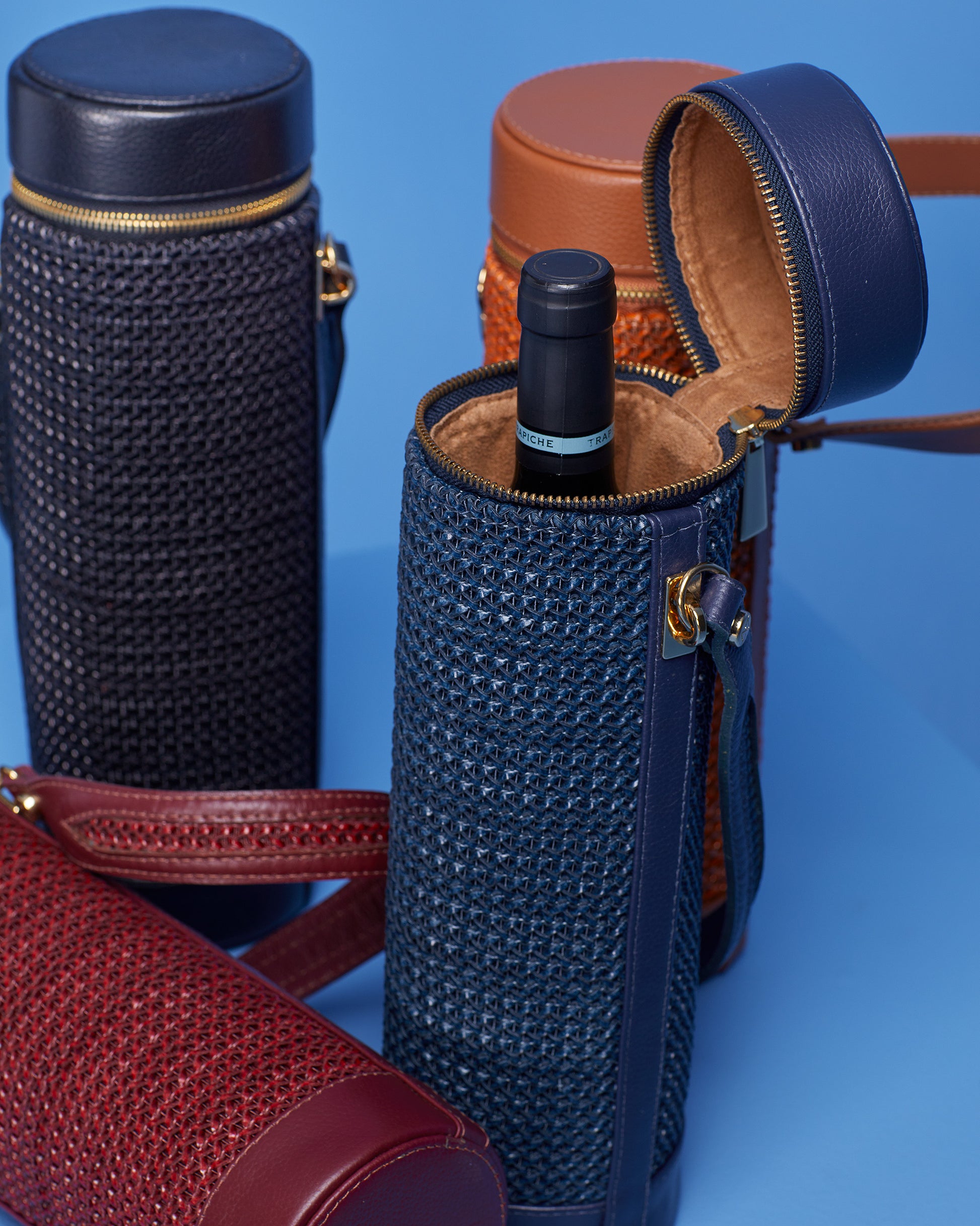 Porta vinho produzido em tramado de fibra têxtil de ráfia e couro legítimo, forrado em camurça.